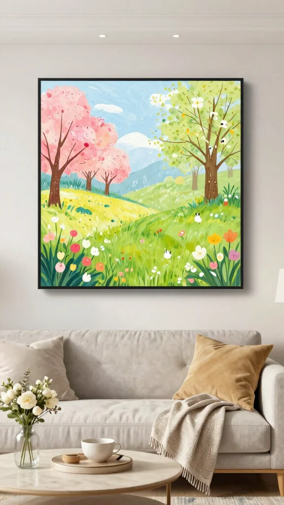 Placement makes the art matter. Aim for eye level (about 57–60 inches from the floor) for most pieces. A large artwork above the sofa or fireplace creates a natural focal point; a gallery wall works well on long walls. Consider the art’s scale relative to furniture and leave enough breathing room. Use lighting—track lights, picture lights, or wall washers—to highlight color and shape. If you have an awkward wall, go vertical with a tall panel or place art on a console behind seating to improve flow. This practical guidance supports home styling tips and keeps living room decor balanced.