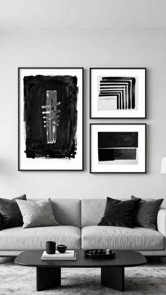 Monochrome art sharpens a room—black, white, and grey become a quiet stage for color pops. Start with one bold black-and-white abstract piece, then layer textures to keep depth without shouting. This is modern wall art living room decorating ideas you can actually use.
