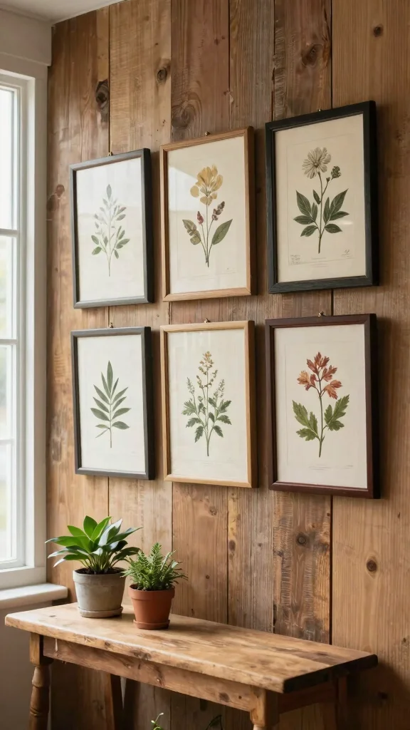 These prints can seamlessly blend with rustic elements in your space. Mix and match frame styles, such as weathered wood and sleek black, to create an engaging display. To enhance the natural ambiance, place a few potted plants nearby, inviting a cozy, serene vibe into your home.