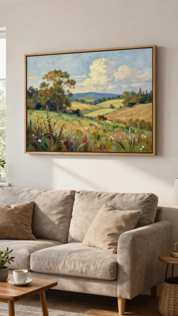Landscape paintings evoke the serenity of the countryside, perfect for creating a cozy atmosphere in your living room. Choose artworks depicting tranquil farms or soft rolling hills to enhance the farmhouse charm. A large landscape piece can draw the eye and serve as a calming focal point.