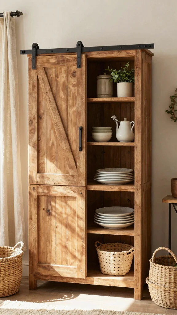 Picture a rustic farmhouse accessories cabinet crafted from reclaimed wood, showcasing its weathered beauty.