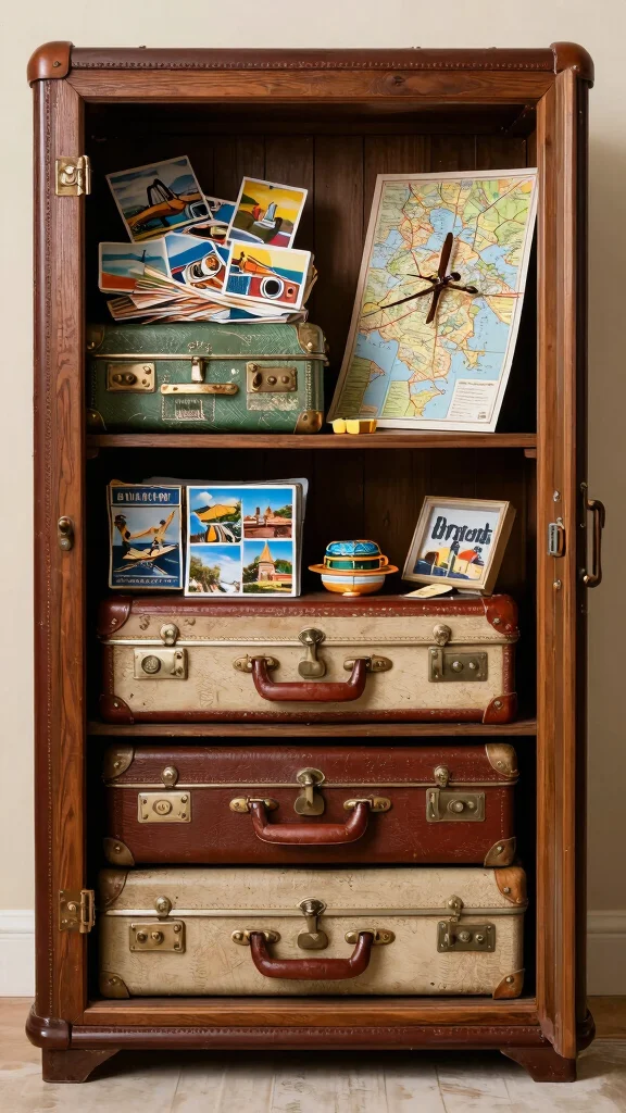 These cabinets repurpose vintage suitcases to display your favorite travel mementos, creating a charming focal point. Stack several suitcases on a sturdy base or mount them on the wall for a whimsical display. Each suitcase can hold different themed items, like postcards or maps, sparking conversations.