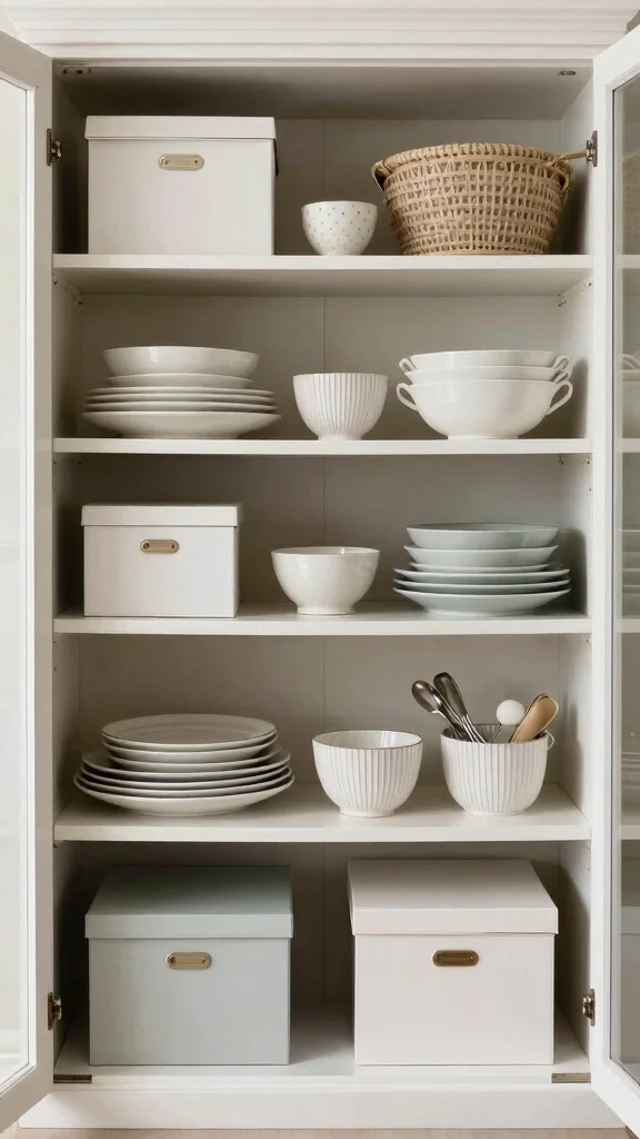 Add decorative storage with matching boxes or trays to keep the display cohesive and intentional—these are classic stylish cabinet ideas.