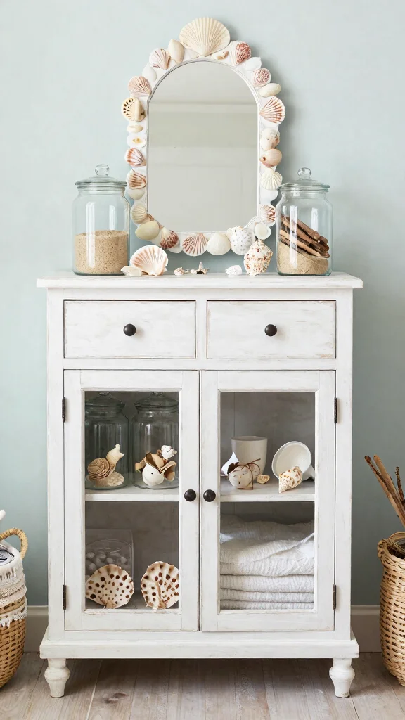 Invite coastal serenity into your home with a shabby chic accessories cabinet that radiates freshness.