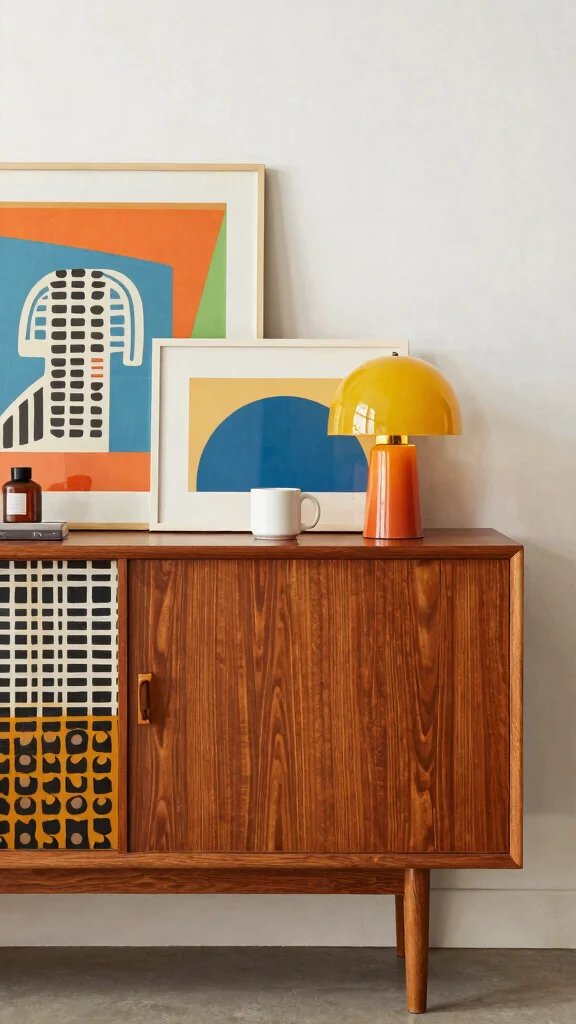 Often crafted from rich woods and featuring bold pops of color, these cabinets serve as stylish storage solutions while acting as focal points in your room. They’re perfect for showcasing funky accessories or vibrant art pieces, injecting an upbeat vibe into your space. Complement the retro feel with geometric patterns in your decor.