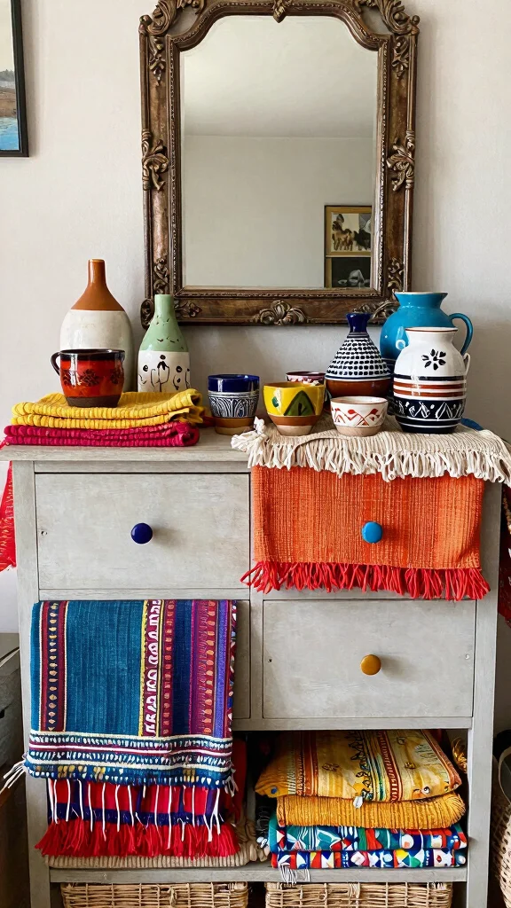 This style embraces vibrant colors, rich textures, and diverse patterns, creating a canvas for your collection of unique treasures from travels or thrift shops. Look for vintage cabinets with mismatched knobs or ornate mirrors that add character. Layer in colorful textiles or handmade pottery for a cozy, laid-back vibe.