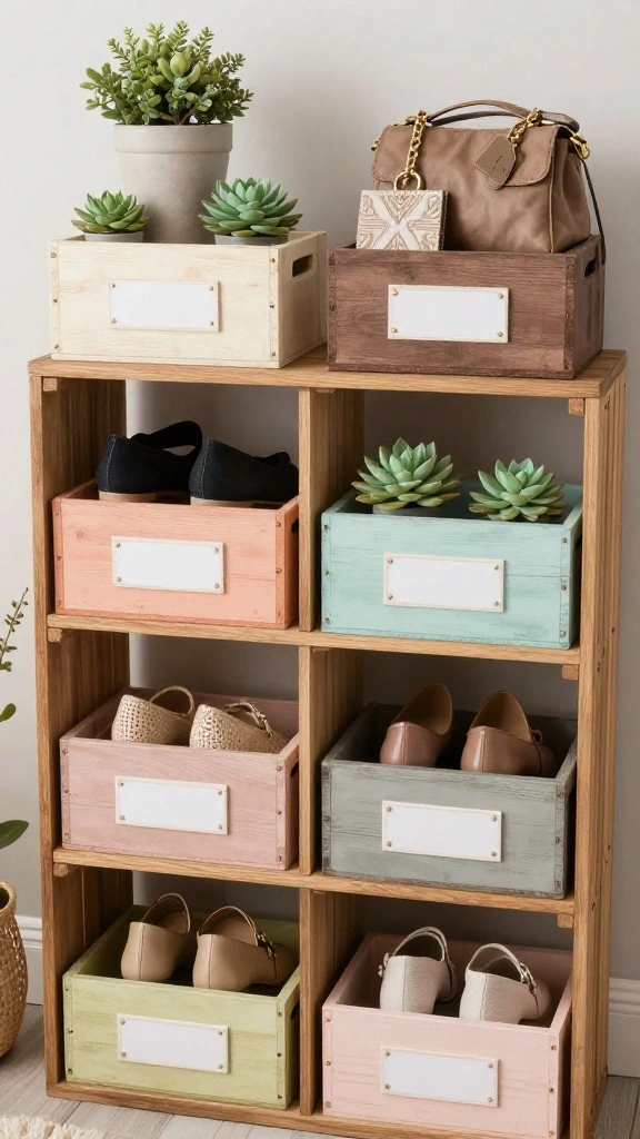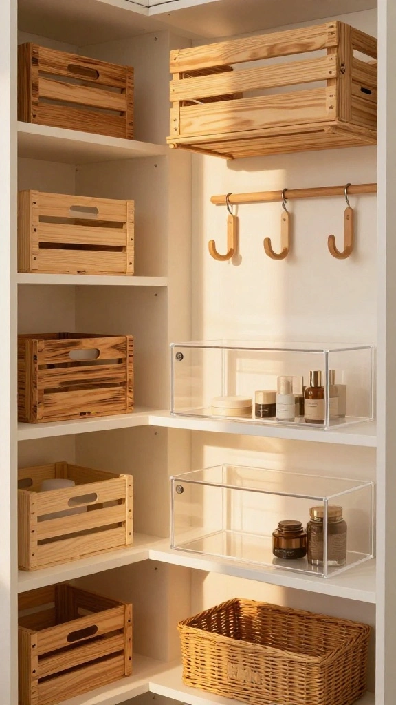 Using wooden crates is a sustainable choice that enhances your decor while keeping your accessories tidy. The natural wood brings warmth and texture, making it an inviting storage solution.