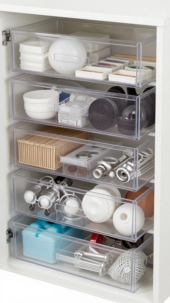 Clear plastic drawer organizers are a practical solution for those who prefer a more traditional approach to accessory organization. These handy tools can be used in drawers or on shelves, helping you sort items by type or size. They ensure that everything has its place while maintaining a tidy appearance.