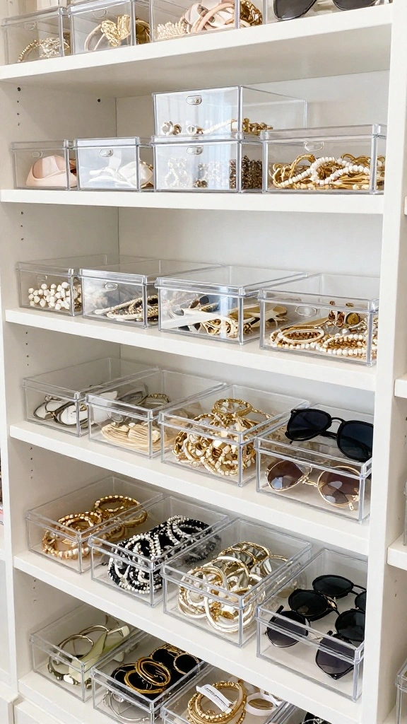 Utilize clear acrylic boxes to easily view and access your accessories while keeping them organized and dust-free.