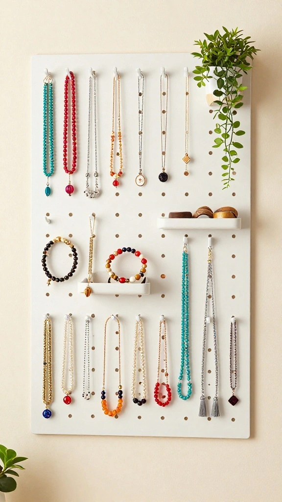 – Wall-mounted hooks or pegs for necklaces and hats