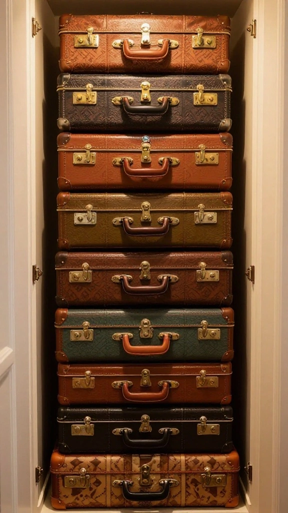 Incorporate vintage suitcases for a unique storage solution that adds character while keeping your accessories concealed.