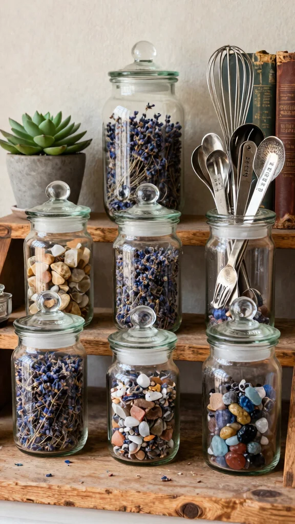 Display small items in vintage apothecary jars for an organized and visually appealing look.
