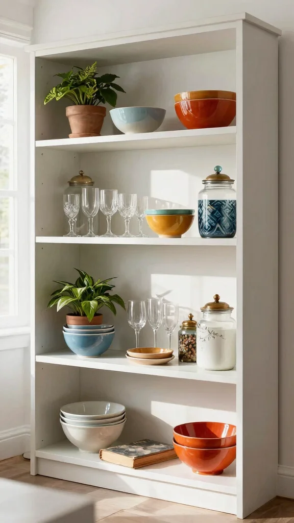 Open Shelf Styling Ceramic bowls, decorative jars Leave empty spaces for balance