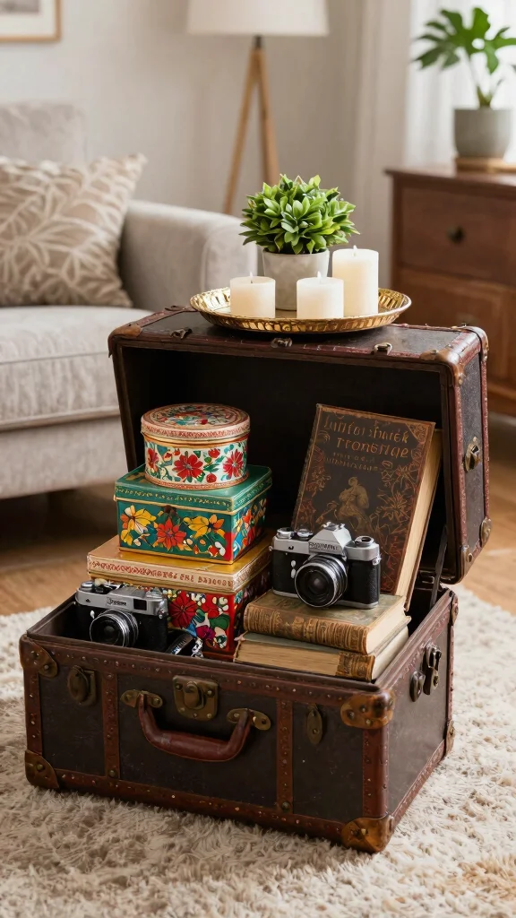 An antique trunk serves as both stylish storage and a charming display for your vintage accessories. Use it as a coffee table or decorative side table in your living room, keeping it open to reveal your collection.