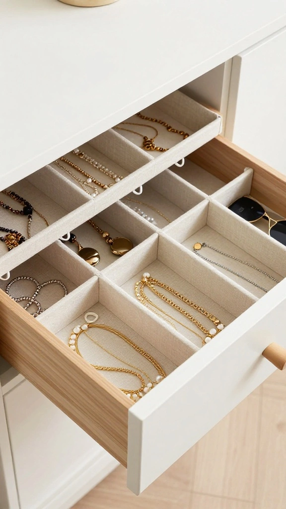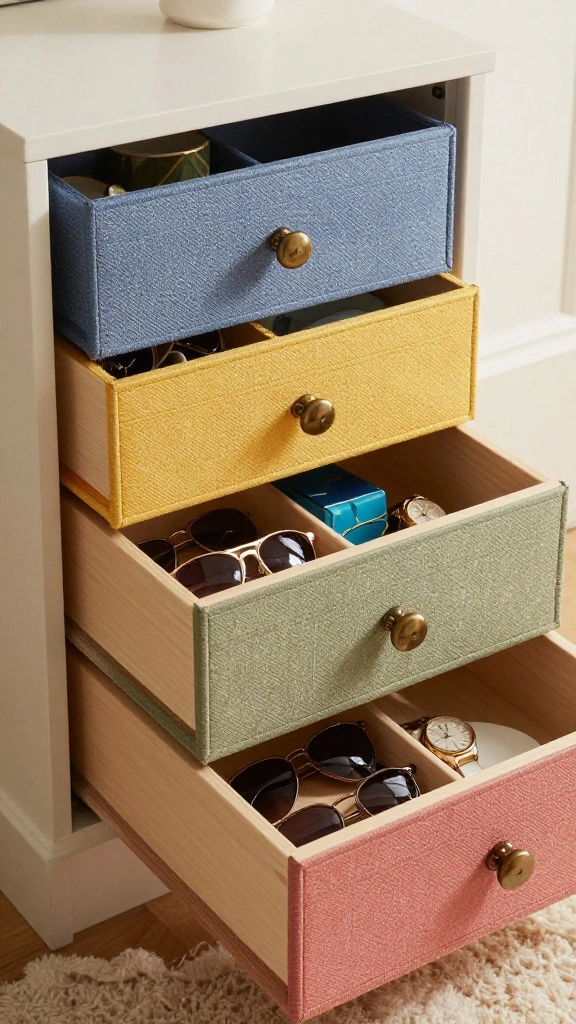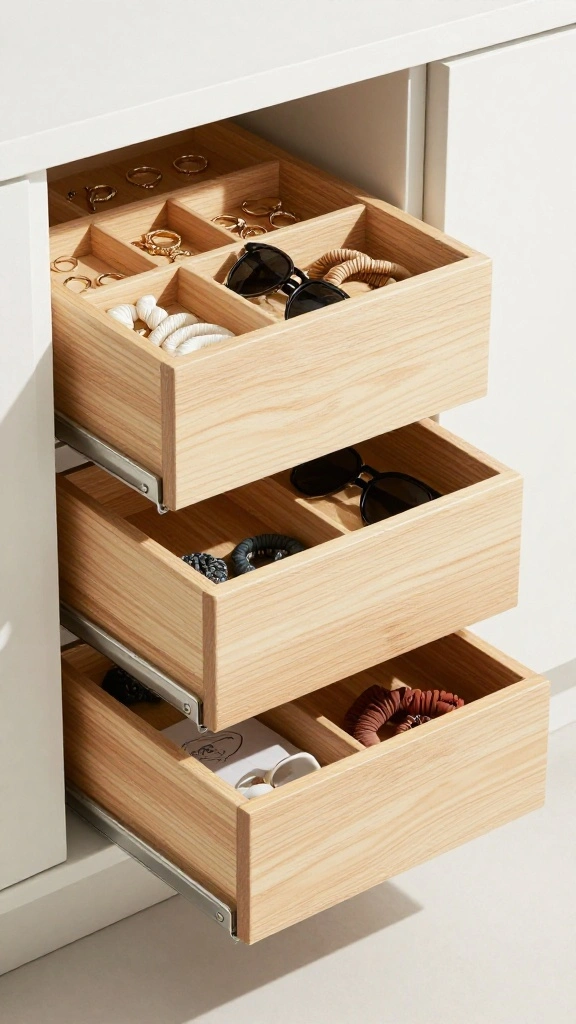 Implementing a tiered system for your accessories drawer is a smart way to use vertical space effectively. This organization method is especially helpful for larger items such as clutches and sunglasses, allowing you to see everything without digging through.