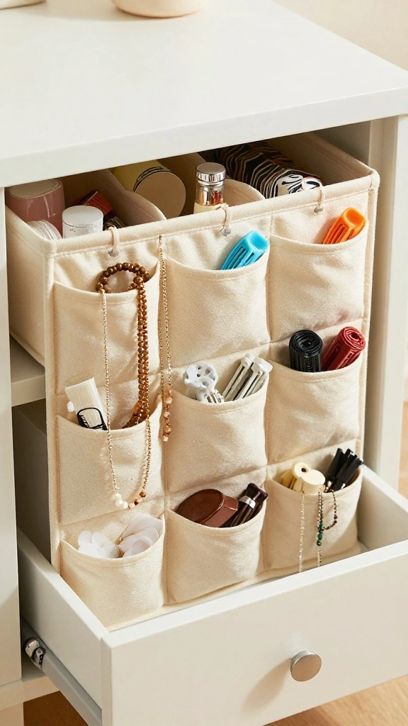 With various pockets, these organizers can hold jewelry, hair accessories, sunglasses, and small bags. This keeps everything separate while making items easily visible and accessible, transforming your drawer into an organized paradise.