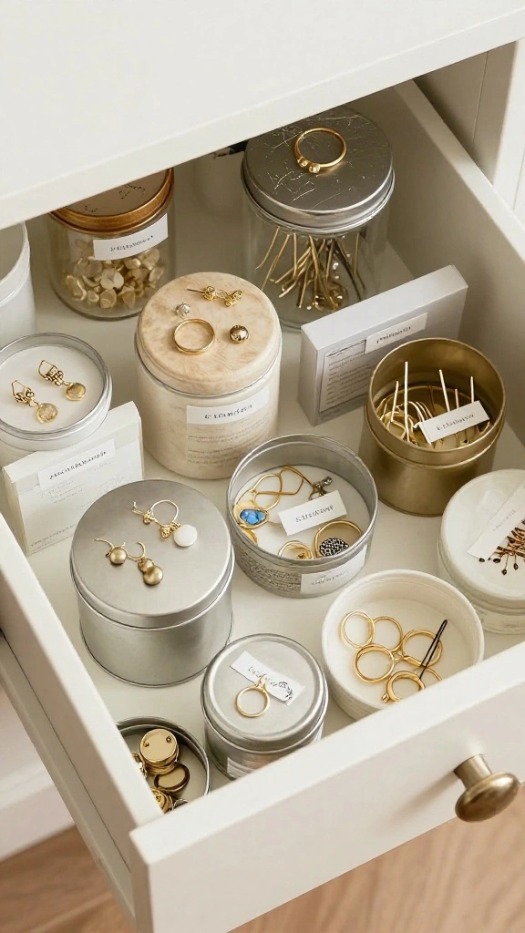 Repurposing small containers is a creative and cost-effective way to organize your accessories drawer. Think beyond traditional storage—small jars, tea tins, or even old makeup containers can serve as chic organizers.