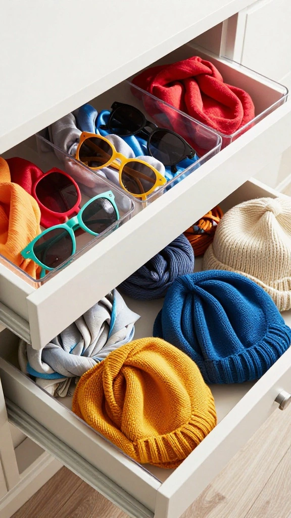 Designate a space for seasonal items, like sunglasses for summer and scarves for winter. Use clear bins to organize these pieces, making it easy to switch them out as the seasons change. This method not only saves space but also encourages you to utilize all your accessories.