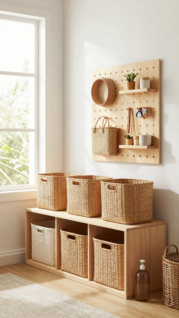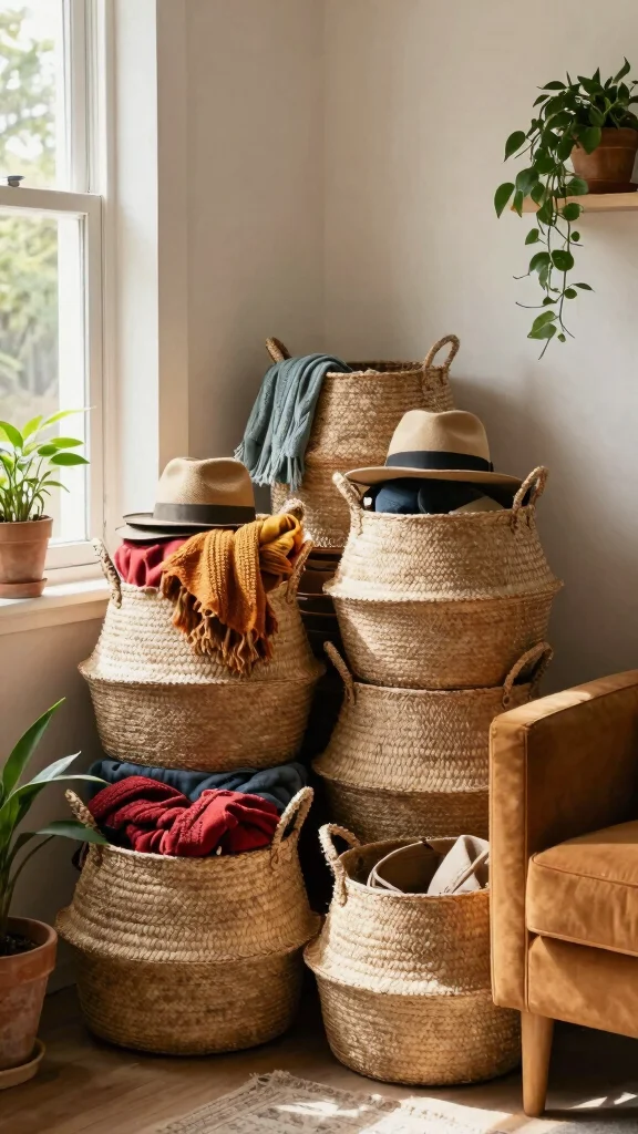 Eco-friendly storage baskets from seagrass and jute prove that accessories organization ideas can be stylish and simple. Pro tip: dedicate baskets by item type—throws, hats, bags—and sizes—small, medium, large—for instant tidy results and a warmer home.