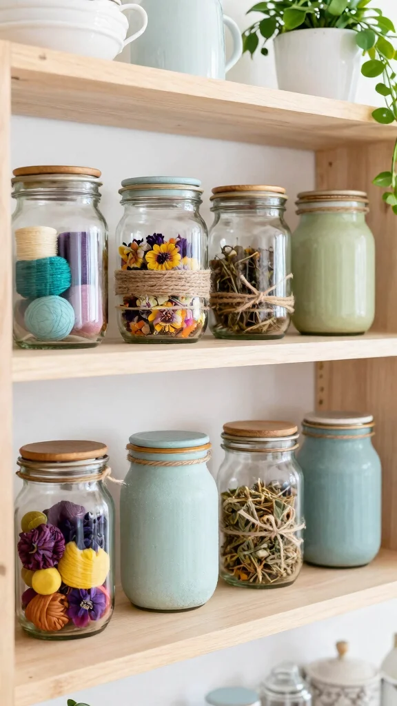 Consider painting or wrapping jars with twine for a personalized touch. Use them to store larger accessories like belts or scarves, and label each jar for easy identification. Displaying these jars by grouping them in varying sizes creates an engaging visual on shelves or countertops.