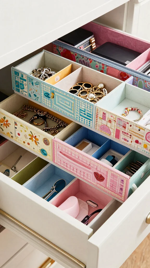 Measure your drawers to ensure a perfect fit for your organizers, and use decorative paper or fabric to cover them, adding a stylish touch. Regularly checking and decluttering the contents helps maintain order and keeps your space feeling fresh.