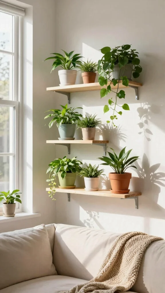 Install floating plant shelves to combine greenery with accessory displays, enhancing aesthetic appeal.