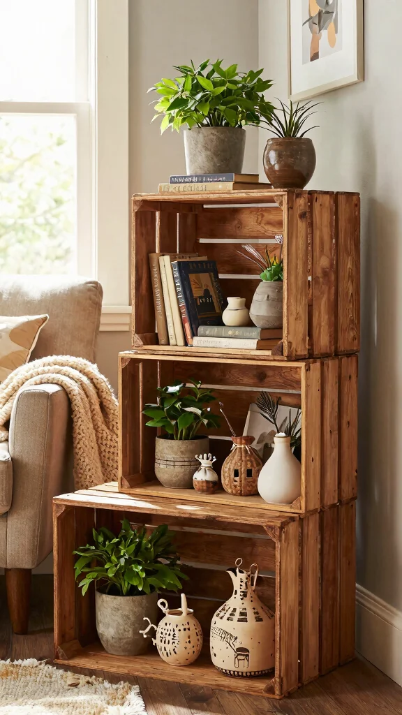 Crates offer an economical, charming way to display your favorite items. Available in various sizes, they can be creatively stacked or arranged to suit your decor needs. Their rustic appeal pairs beautifully with both modern and farmhouse styles.