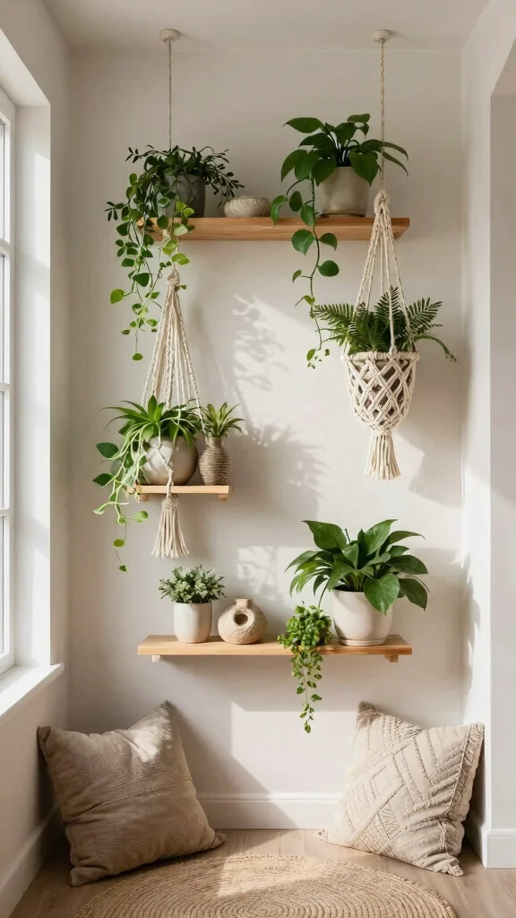 Hanging macrame shelves infuse your home with a bohemian touch. These airy, handcrafted pieces not only showcase your accessories but also add artistic flair to your decor. Made from sustainable materials, they create a relaxed vibe, perfect for a calming atmosphere.