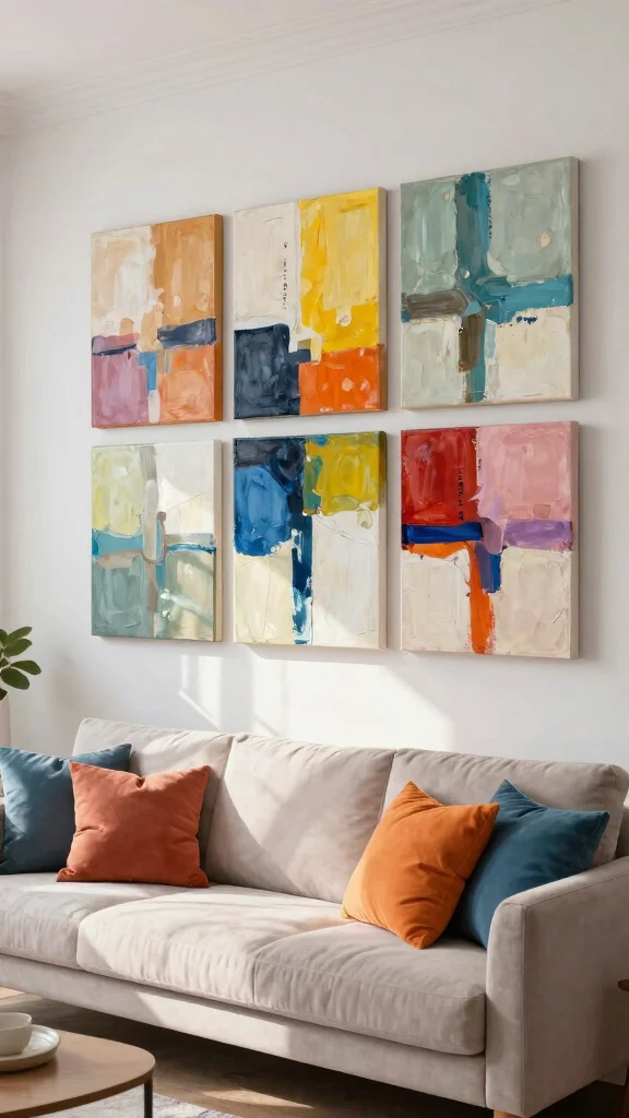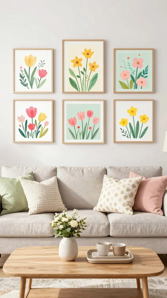 Seasonal art keeps your living room feeling fresh—rotate pieces with the seasons to echo spring pastels or autumn warmth. Pro tip: set up a dedicated storage area and weave in natural elements to elevate your art wall living room ideas without breaking the bank.