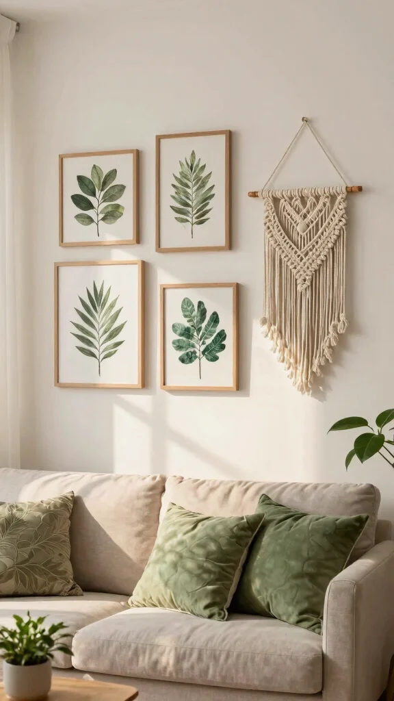 To curate a nature-inspired gallery, focus on a soothing color palette of greens and browns. Mixing textures, such as woven macrame or twig frames, adds depth and interest to your wall. Consider incorporating live plants as art to further enhance the natural aesthetic.