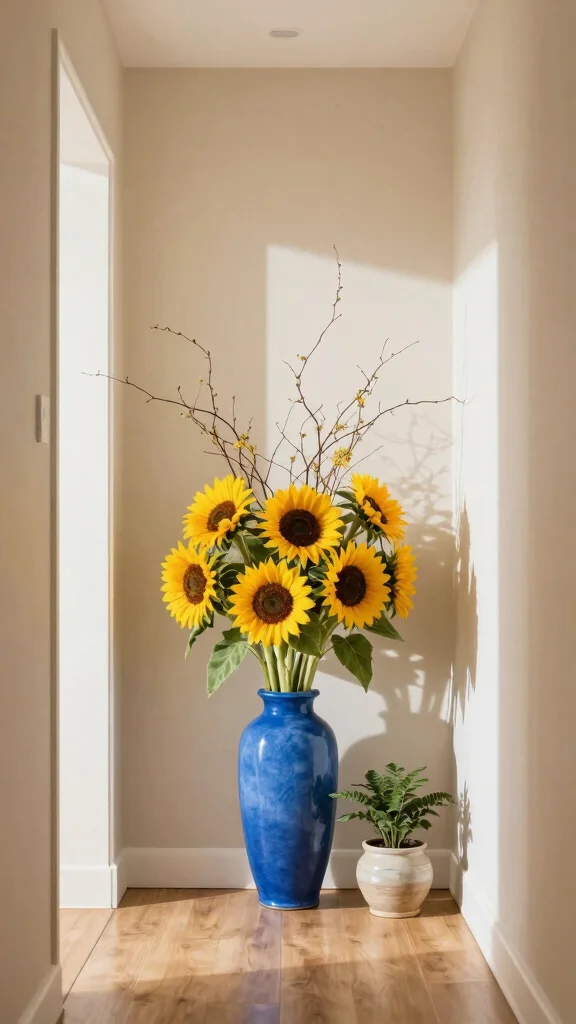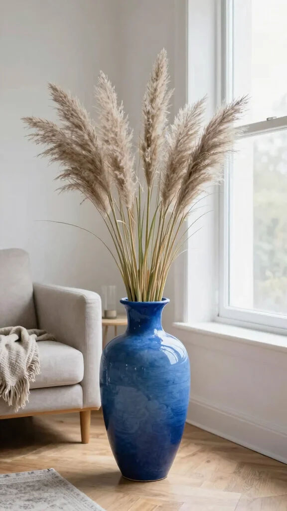 Use a tall blue vase to create a stunning focal point in your living space, drawing attention and adding height.