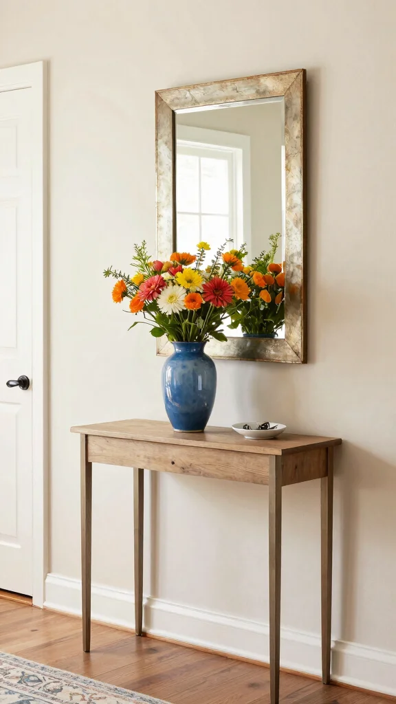 For practical tips, use a variety of heights and shapes to create depth in your entryway decor. Pairing a smaller vase alongside a taller one provides balance and visual interest while maintaining functionality with elements like a catch-all dish for keys.