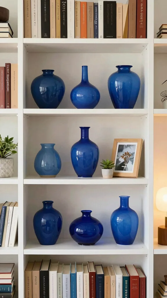 Place blue vases on bookshelves to add color and style, creating visual interest among books and decor items.