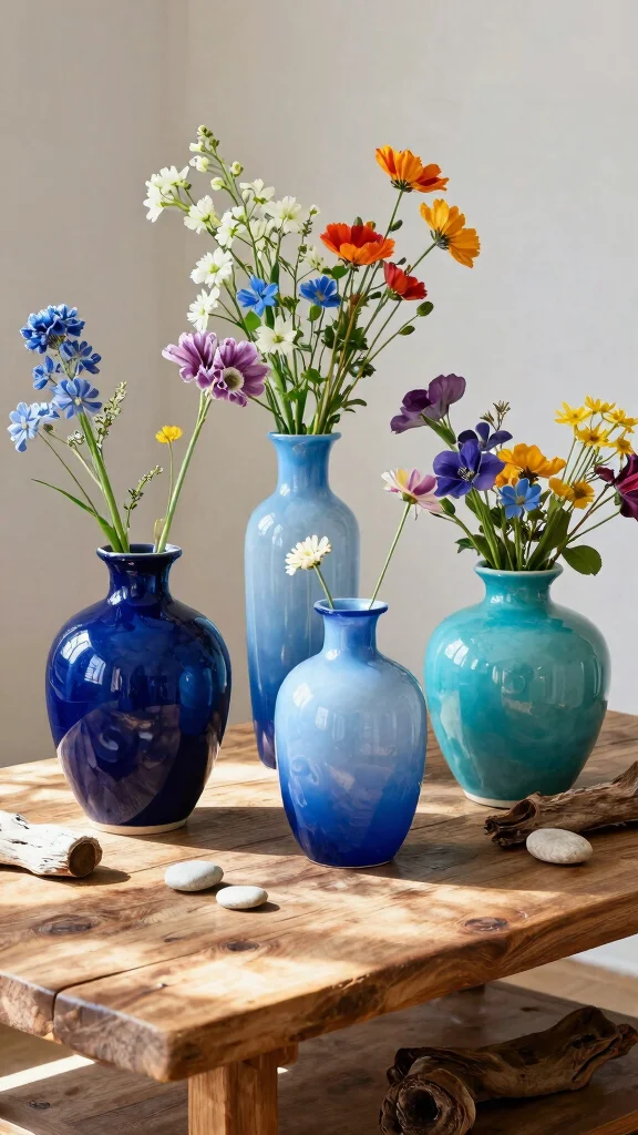 Combine various shades of blue vases to create a cohesive yet dynamic look that enhances coastal decor themes.