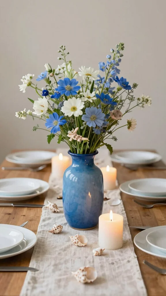 A decorative blue vase can transform into a stunning centerpiece for dining or side tables, making a bold statement while enhancing your coastal decor. Select a large vase that commands attention, and fill it with seasonal flowers that echo the colors of the sea or opt for dried florals for a rustic touch. Surround the vase with candles or small seashells to create a cohesive coastal centerpiece that invites conversation.