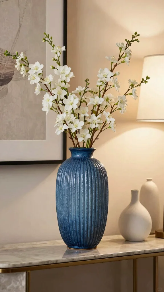 Use an entryway console, slim mantel, or coffee table as a staging ground for 1–3 vases. In small spaces, choose one tall vase to create vertical interest and leave space for airflow. Place near natural light to let the blue glow and reflect with a mirrored tray or glass surface to amplify brightness. This approach helps anchor coastal home decor in compact areas.