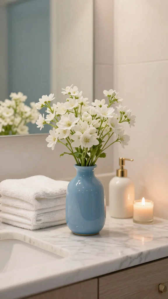 Incorporate blue vases into your bathroom decor for a refreshing and serene coastal touch that complements the space.