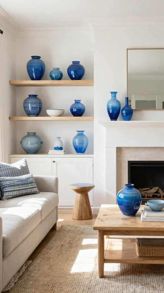 Start by picking 2-3 blue tones and pair them with white and sandy neutrals. Combine materials like wood, wicker, rope, and glass to echo beach textures. Avoid busy patterns near the vases; keep surfaces uncluttered and let the blue vases pop. Repeat color accents across accessories to achieve a harmonious coastal color schemes and interior design ideas vibe.