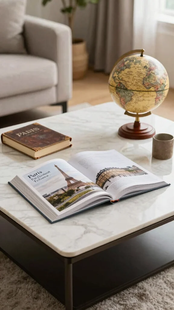 Select travel-themed coffee table books to spark wanderlust and share personal adventures with guests.