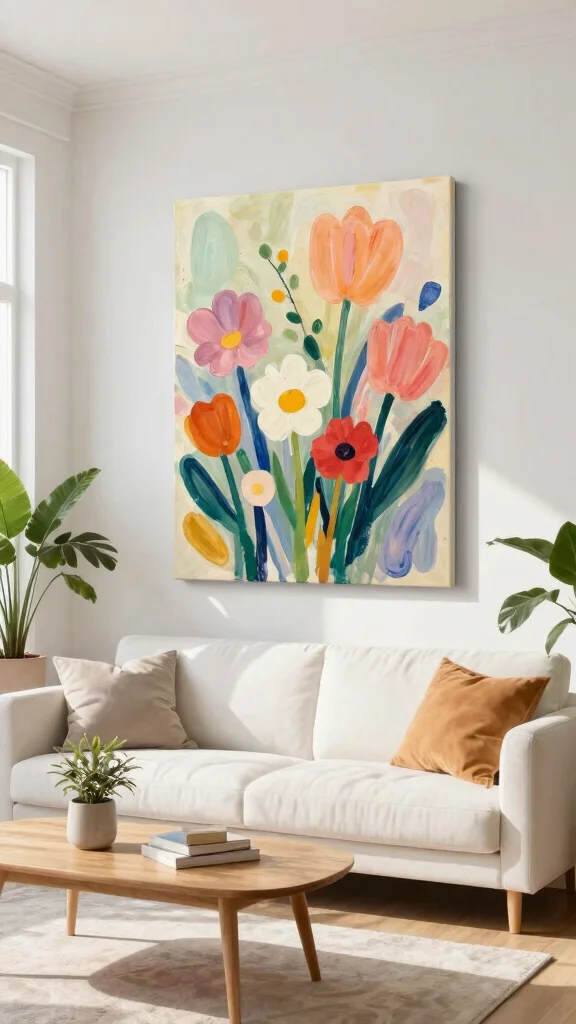 When selecting large art pieces, ensure they are proportionate to your wall and surrounding decor. Bright colors can serve as a striking focal point, while maintaining flow with other elements in the room can enhance the overall look.