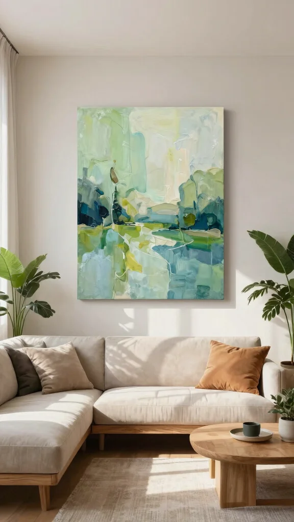 Incorporating nature-inspired abstract art in your living room can create a serene and calming environment. This style reflects the beauty of the outdoors through colors and shapes reminiscent of landscapes and flora. Soft greens and tranquil blues can harmonize with earthy tones, enhancing the overall tranquility of your space.