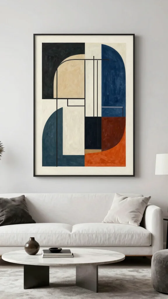 When incorporating geometric art, consider using a mix of smaller pieces to form a gallery wall or a large canvas as a centerpiece. This style beautifully complements minimalistic furniture, providing balance and structure to your space.