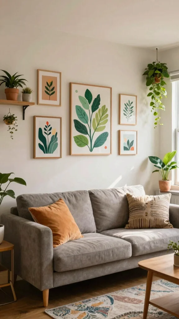 – Consider layered wall art to create depth and interest, while wall planters can add a unique green element to your living room.
