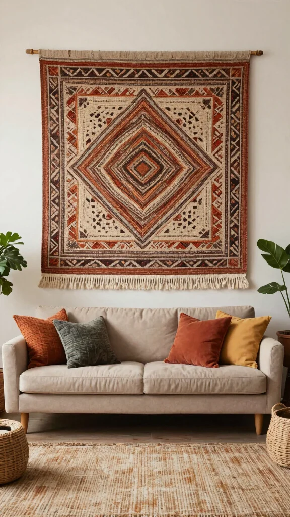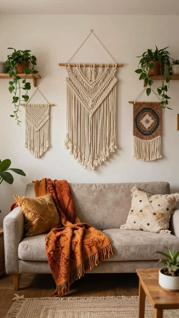 Fun fact: Layering 3 different textures—macramé, woven textiles, and beads—creates a 3D focal point in any space. This boho approach makes a colorful wall art living room feel instantly cozy and inviting to guests.