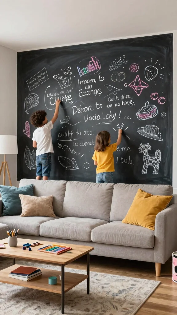 Incorporate interactive art displays, like chalkboards or magnetic boards, into your living room to keep things fresh and engaging. These dynamic pieces encourage creativity, allowing you to change the display with your family’s favorite photos, quotes, or kids’ artwork.
