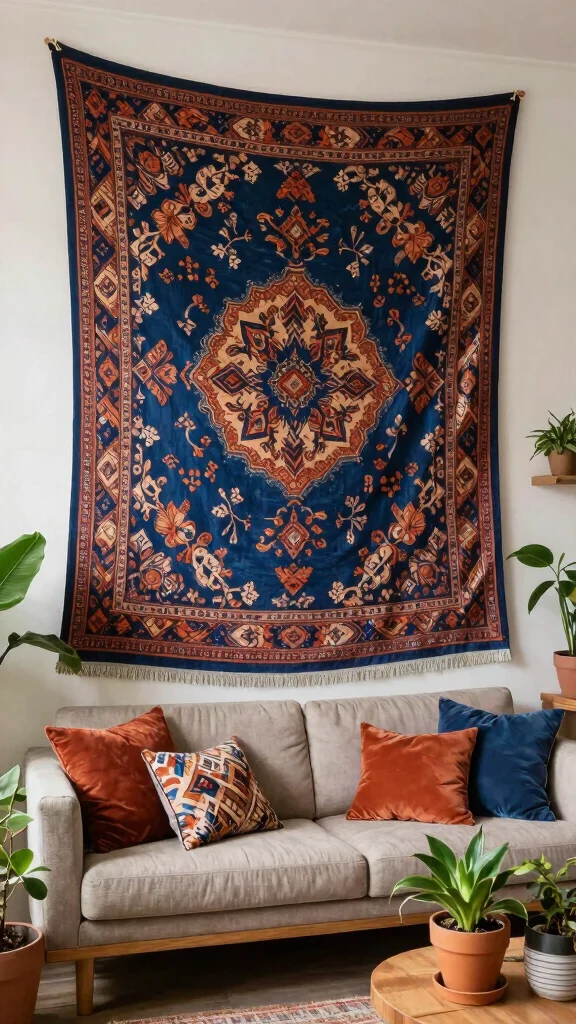 Tapestries offer a unique way to add soft texture and warmth to your living room walls. Their fabric construction introduces visual interest while making a bold statement.