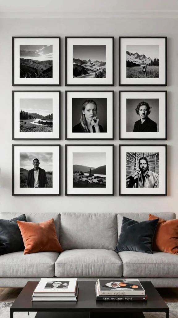 Start by selecting a cohesive color palette that unifies your collection, inspired by your living room’s dominant hues or a shared theme like nature or travel. Mixing frame styles and sizes can add a charming eclectic vibe that feels inviting.