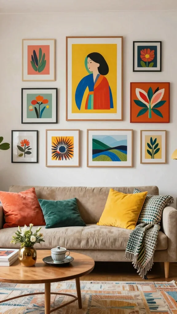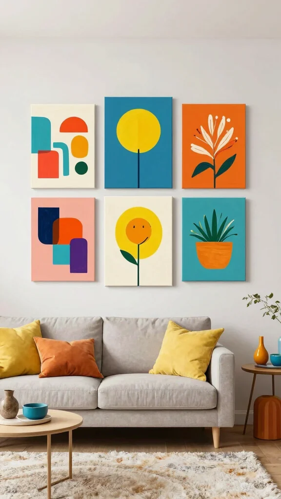 Whimsical art makes a living room feel alive; colorful wall art living room pieces invite smiles and conversation. Mix bright prints with playful subjects, then swap in new favorites every season to keep the vibe fresh and joyful.