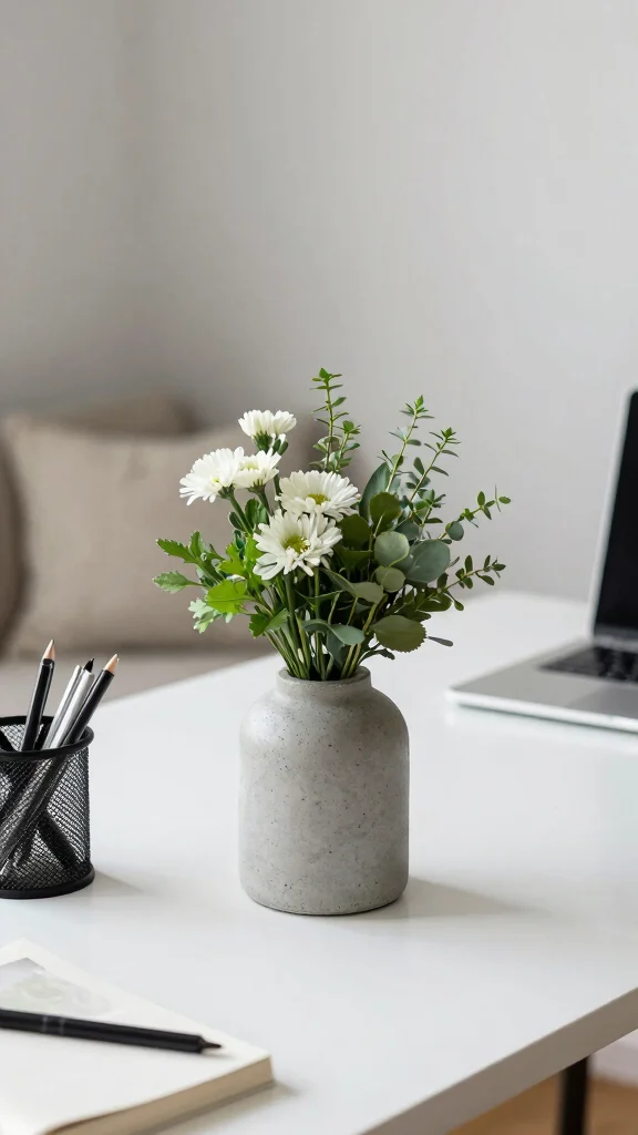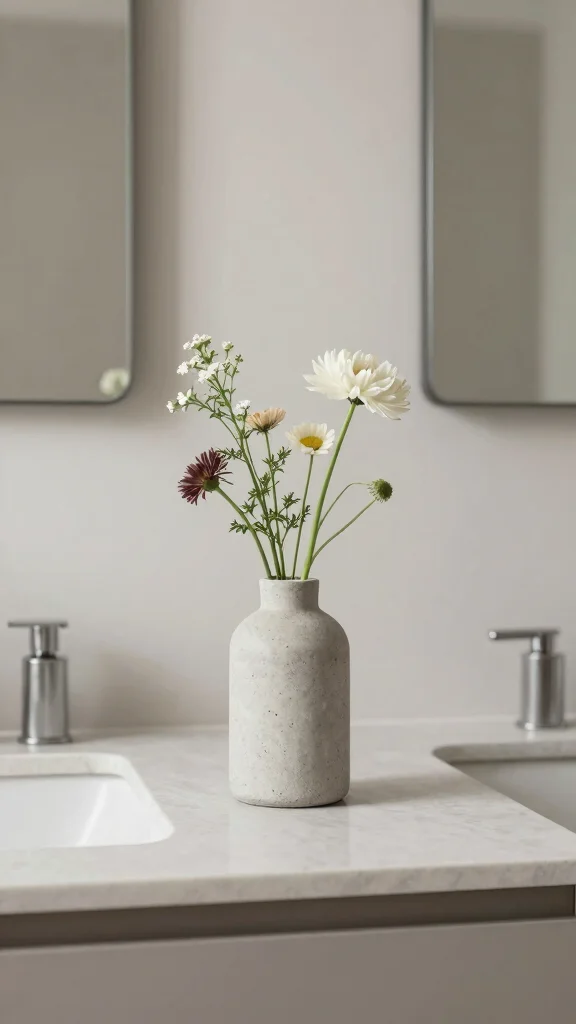 Use dried stems or simple greenery to maintain low water usage. Mix textures—light wood, stone, and metal—with concrete vases to keep things warm rather than stark.
