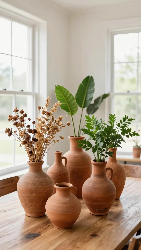 To make the most of terracotta’s unique qualities, consider these practical tips: opt for a medium-sized vase filled with seasonal blooms on your dining table for an instant color boost. For a more dynamic centerpiece, arrange several small terracotta vases of varying heights together. Incorporating lush greenery alongside these vases enhances their earthy vibe, bringing nature right into your home.